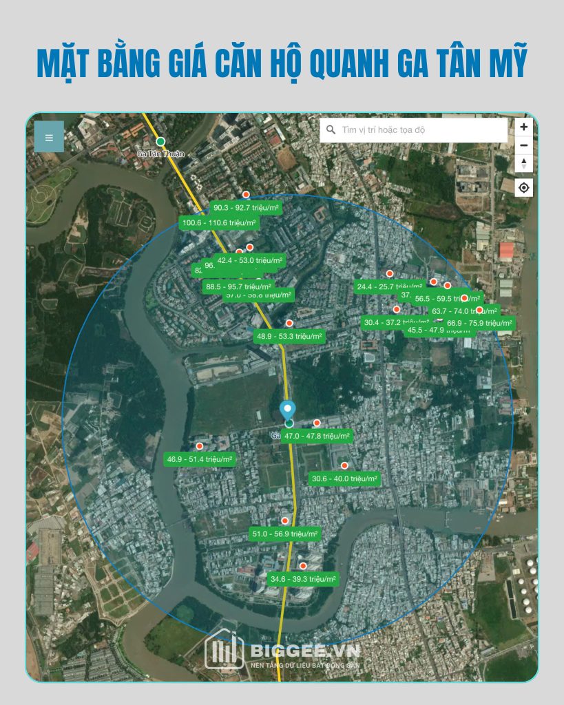 Khu vực Tân Mỹ nằm liền kề KĐT Phú Mỹ Hưng – một không gian được quy hoạch chuẩn mực với mức độ hoàn thiện cao. Sự hiện diện song song giữa các dự án cao cấp và các sản phẩm dưới 50 triệu/m² tạo nên khoảng trống rõ rệt về giá, cho phép vùng này có dư địa tăng trưởng khi hạ tầng mới hình thành. Thêm vào đó, quỹ đất lớn kế cạnh vị trí ga đề xuất đang được định hướng phát triển thành khu đô thị TOD, tạo động lực gia tăng mật độ hoạt động và giá trị thương mại.