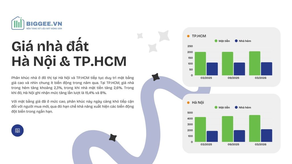 Phân khúc nhà ở đô thị tại Hà Nội và TP.HCM tiếp tục duy trì mặt bằng giá cao và nhìn chung ít biến động trong năm qua. Tại TP.HCM, giá nhà trong hẻm tăng khoảng 2,3%, trong khi nhà mặt tiền tăng 2,6%. Trong khi đó, Hà Nội ghi nhận mức tăng lần lượt là 15,4% và 8%. Với mặt bằng giá đã ở mức cao, phân khúc này ngày càng khó tiếp cận đối với người mua mới, qua đó hạn chế khả năng xuất hiện các biến động đột biến trong ngắn hạn.