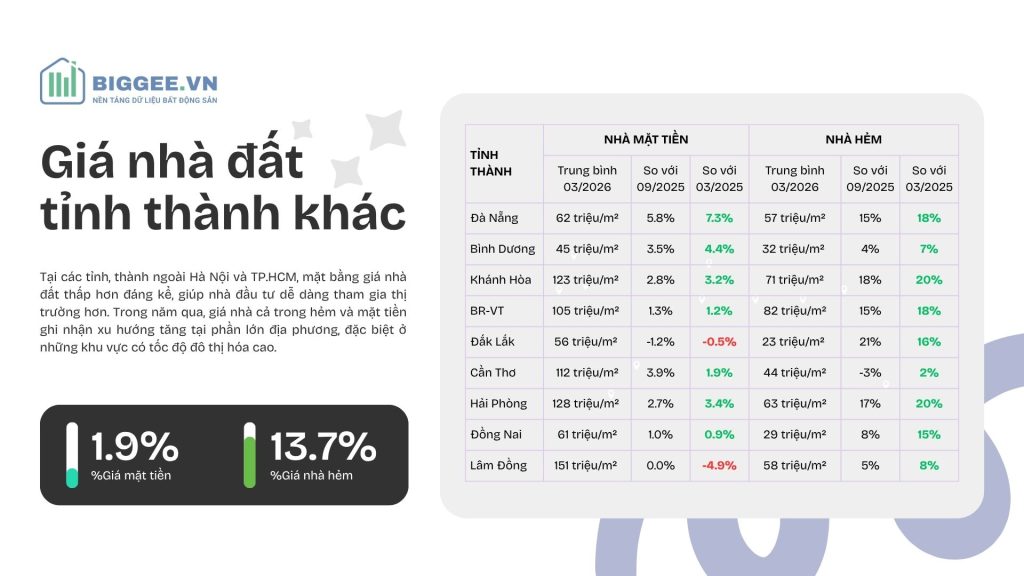 Tại các tỉnh, thành ngoài Hà Nội và TP.HCM, mặt bằng giá nhà đất thấp hơn đáng kể, giúp nhà đầu tư dễ dàng tham gia thị trường hơn. Trong năm qua, giá nhà cả trong hẻm và mặt tiền ghi nhận xu hướng tăng tại phần lớn địa phương, đặc biệt ở những khu vực có tốc độ đô thị hóa cao.