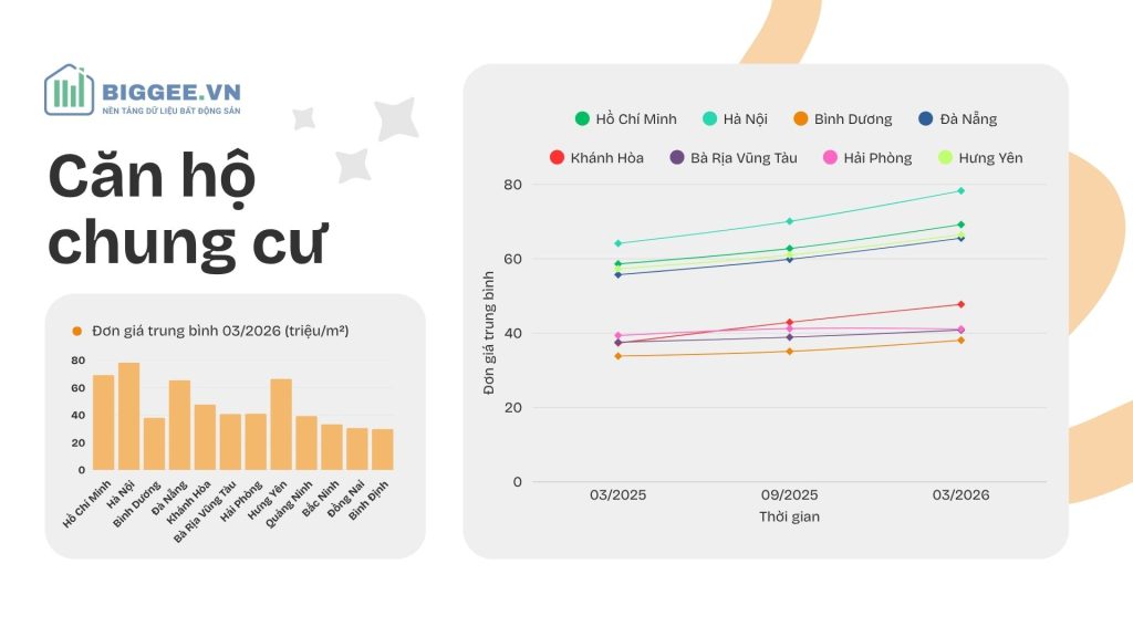 Giá chung cư tiếp tục duy trì đà tăng trong năm qua, với mức tăng bình quân khoảng 19%, đưa đơn giá trung bình lên 67,6 triệu/m². Tuy nhiên, từ sau tháng 09/2025 đến nay, tốc độ tăng đã có dấu hiệu chậm lại tại hầu hết các tỉnh, thành, cho thấy thị trường đang dần bước vào giai đoạn ổn định hơn sau nhịp tăng trước đó.