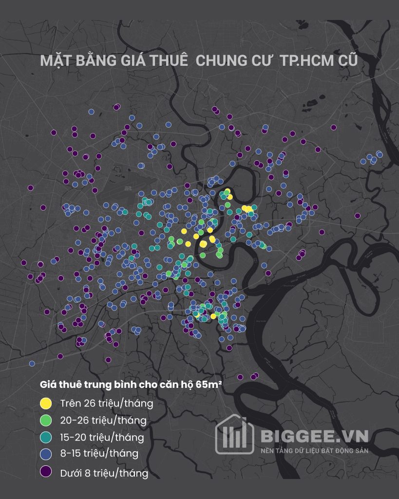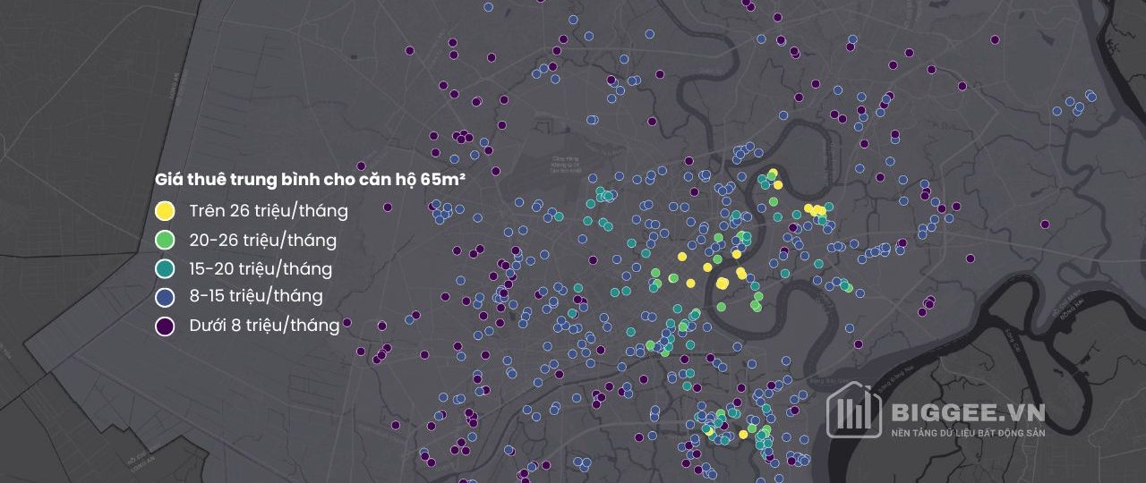 Ở chiều ngược lại, phân khúc cho thuê cao cấp với mức giá trên 26 triệu đồng/tháng (tương đương 1.000 USD) tập trung chủ yếu tại các khu vực trung tâm và những khu đô thị có cộng đồng chuyên gia, người nước ngoài sinh sống như Quận 1 cũ, Thủ Thiêm, Thảo Điền, An Phú và Phú Mỹ Hưng. Hiện có khoảng 20 dự án ghi nhận mức giá thuê này đối với căn hộ 2 phòng ngủ – 65 m², phản ánh nhu cầu ổn định từ nhóm khách thuê thu nhập cao và thị trường chuyên biệt.