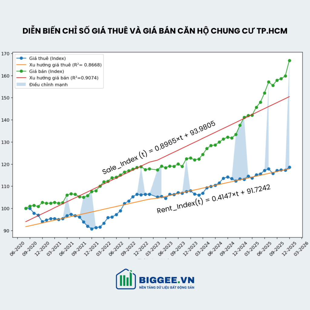 Đáng chú ý, khi đặt thị trường thuê trong mối tương quan với thị trường mua bán, dữ liệu giai đoạn từ 2020 đến nay cho thấy chỉ số giá bán chung cư tại TP.HCM tăng nhanh gần gấp đôi so với chỉ số giá thuê. Điều này phản ánh xu hướng giá tài sản leo thang mạnh hơn nhiều so với tốc độ cải thiện dòng tiền khai thác cho thuê, khiến khoảng cách giữa “giá để ở” và “giá để đầu tư” ngày càng giãn rộng.
