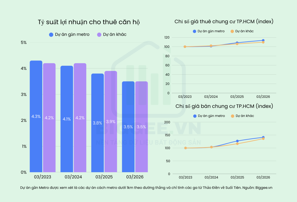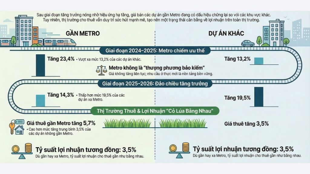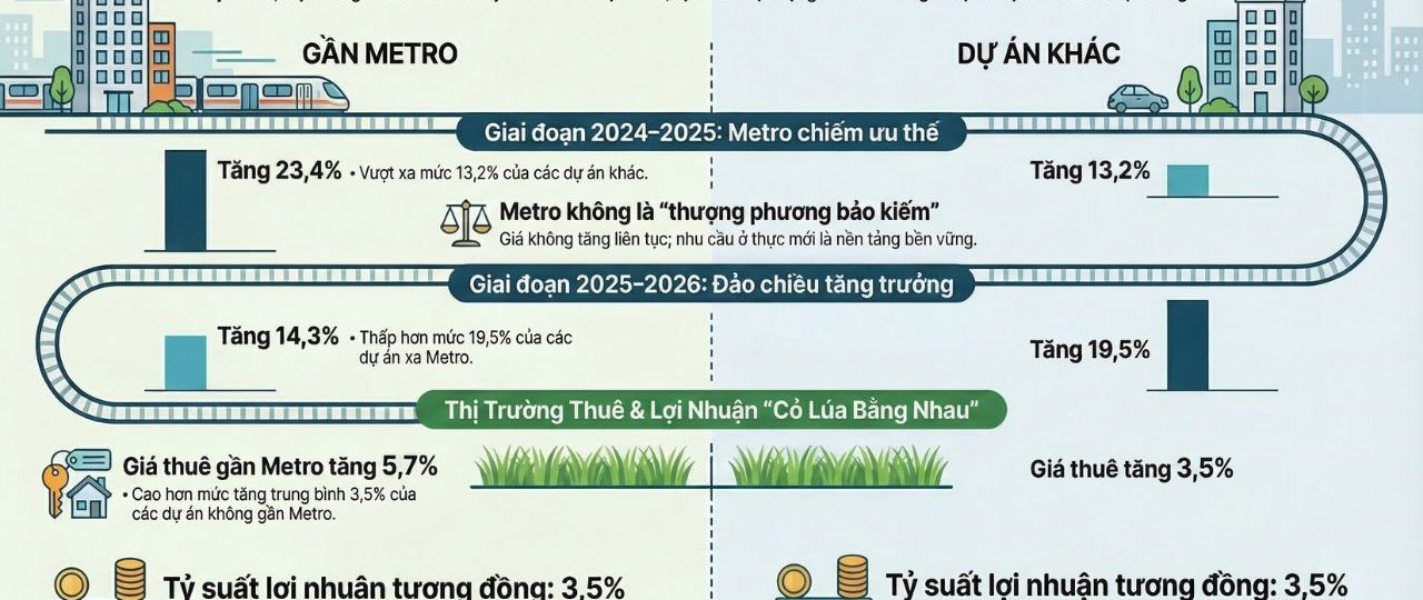 Ở thị trường cho thuê, diễn biến lại theo hướng ngược lại. Các dự án gần metro ghi nhận mức tăng giá thuê trung bình 5,7% trong năm, cao hơn mức 3,5% của các dự án khác. Xu hướng này đã duy trì từ năm 2024 đến nay. Khi kết hợp hai chỉ số bán và thuê, tỷ suất lợi nhuận cho thuê trên toàn thị trường gần như tương đồng, trung bình khoảng 3,5%, bất kể gần hay xa metro — nói cách khác là “cỏ lúa bằng nhau”.