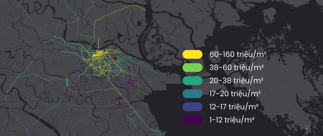 Không bất ngờ khi TP.HCM và Hà Nội dẫn đầu cả nước về số tuyến đường vượt ngưỡng 100 triệu đồng/m², bởi đây là hai đô thị có quy mô dân số và kinh tế lớn nhất.