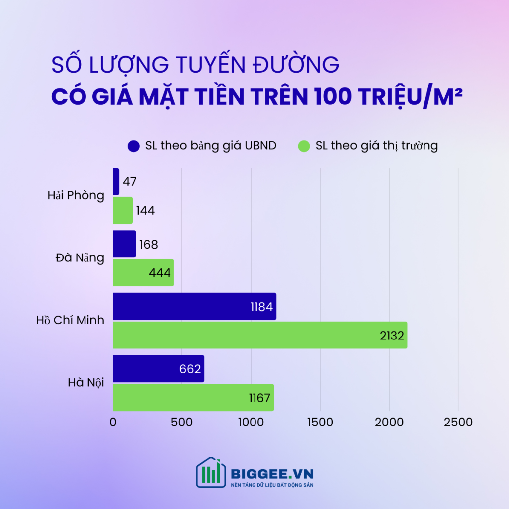 Thống kê này xem xét đồng thời giá đất theo bảng giá Nhà nước và giá đất thị trường, tập trung vào số lượng tuyến đường có giá trên 100 triệu đồng/m². Dữ liệu được tổng hợp từ dự thảo bảng giá đất lần đầu do UBND các thành phố ban hành, kết hợp với mô hình phân tích giá thị trường của Biggee.