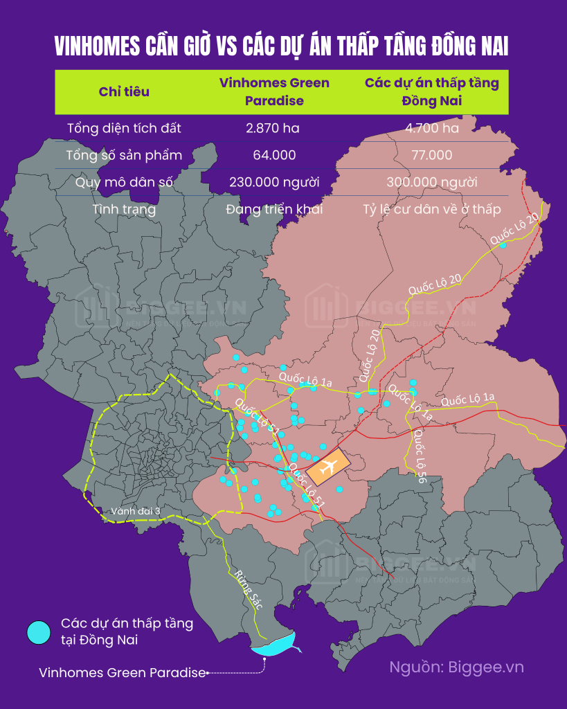 Theo các nguồn tin đáng tin cậy, dự án Vinhomes Green Paradise có quy mô lên tới 2.870 ha, dự kiến cung cấp khoảng 64.000 sản phẩm, đáp ứng chỗ ở cho khoảng 230.000 cư dân. Đáng chú ý, chỉ riêng dự án này của Vinhomes đã tương đương 61% tổng quỹ đất của toàn bộ các dự án thấp tầng từng triển khai tại Đồng Nai. Số lượng sản phẩm và quy mô dân số mà dự án mang lại gần bằng toàn bộ thị trường thấp tầng của cả tỉnh. Dù sự so sánh này không hoàn toàn cùng hệ quy chiếu, nhưng vẫn cho thấy mức độ vượt trội về quy mô và tầm ảnh hưởng của Vinhomes Green Paradise. Điều này cũng đặt ra thách thức không nhỏ trong bối cảnh nhiều khu đô thị lớn tại Đồng Nai vẫn còn tỷ lệ lấp đầy thấp, cư dân về ở chưa nhiều.