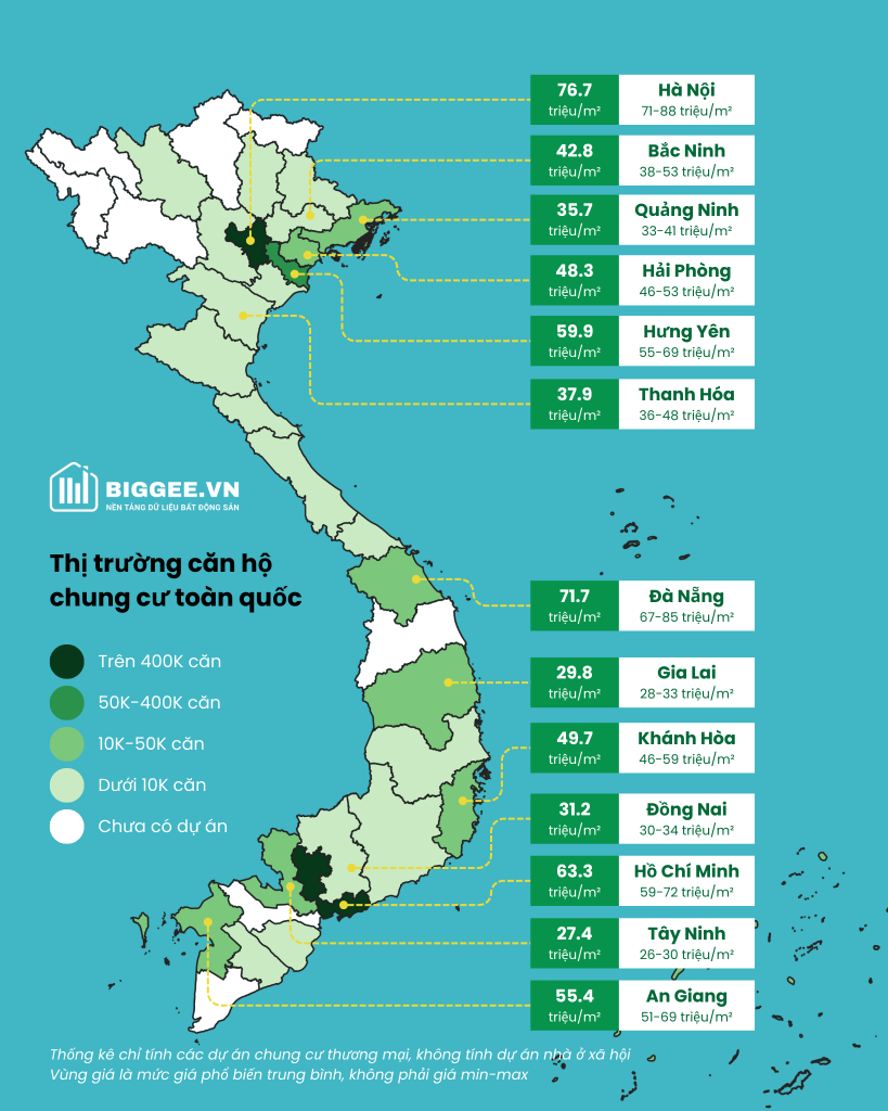 Chung cư vốn là loại hình bất động sản phục vụ trực tiếp nhu cầu nhà ở đô thị. Vì vậy, nguồn cung và giá căn hộ có thể xem như chỉ báo về tốc độ đô thị hóa cũng như tương quan mặt bằng giá bất động sản giữa các địa phương. Bản đồ giá và nguồn cung dự án căn hộ toàn quốc sẽ giúp phác họa bức tranh tổng quan nhất về thị trường.