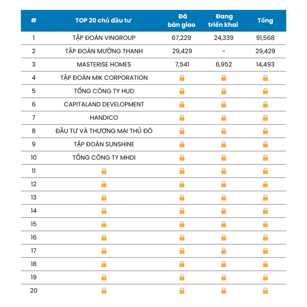 - Top 20 chủ đầu tư có quy mô triển khai lớn nhất,