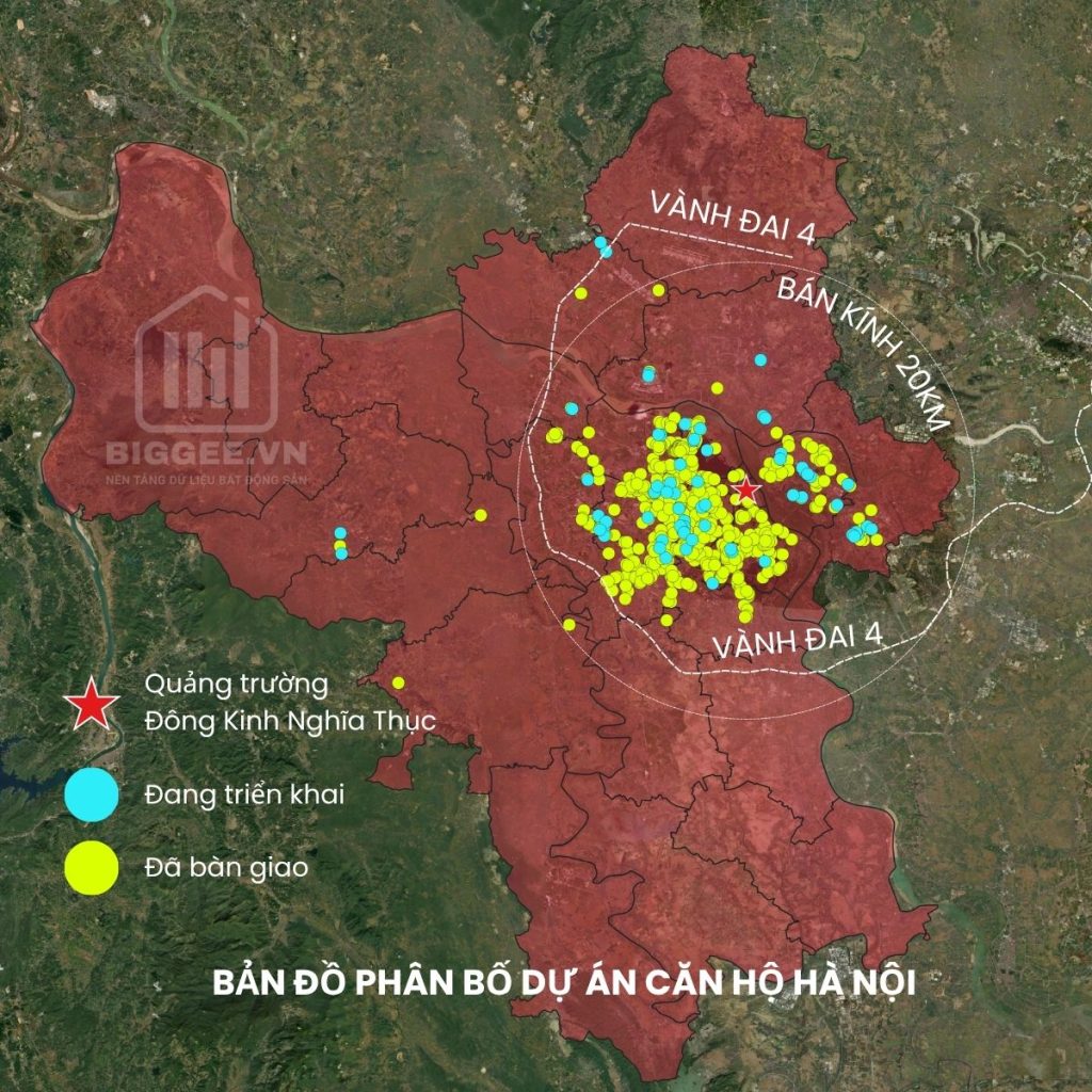 Đây là câu hỏi mà Biggee đã trăn trở trong quá trình nghiên cứu, nhằm tạo cơ sở so sánh khách quan giữa thị trường Hà Nội và các đô thị lớn khác trên cả nước. Để tìm ra câu trả lời, chúng tôi đã tiến hành rà soát và số hóa toàn bộ dữ liệu về các dự án căn hộ chung cư tại Hà Nội, bao gồm thông tin về tọa độ, quy mô, tình trạng triển khai và thời điểm bàn giao.