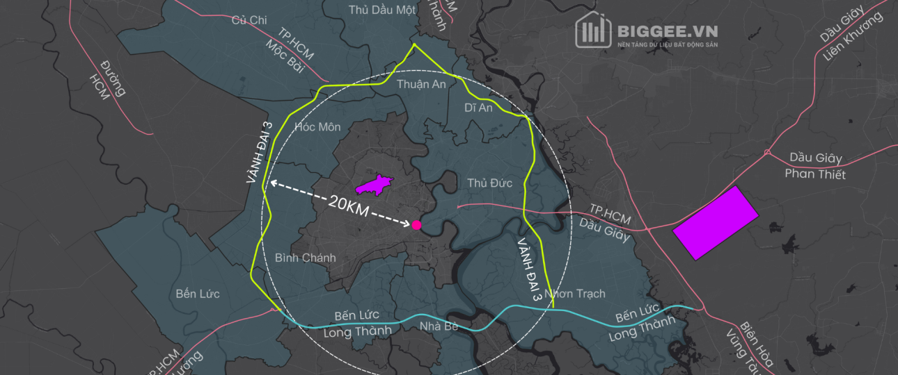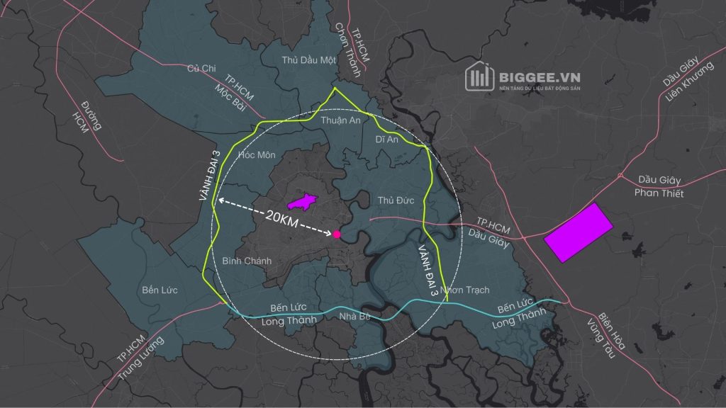 Thứ nhất, lớp kết nối đô thị trong bán kính 20km đến trung tâm: Phần lớn các khu vực dọc tuyến nằm trong phạm vi dưới 20km đến trung tâm TP.HCM, đủ gần để duy trì liên kết kinh tế – việc làm – dịch vụ, đồng thời đủ dư địa để hình thành các cực đô thị mới.