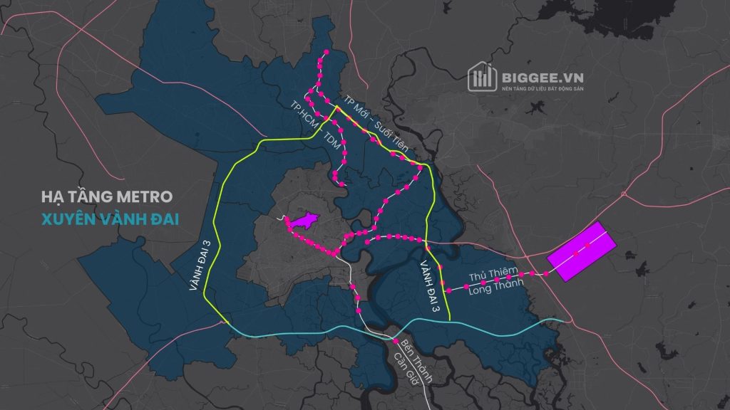 Thứ hai, lớp giao thông công cộng với các tuyến metro xuyên vành đai: Dọc tuyến đã có 4 tuyến metro được phê duyệt hoặc ưu tiên phát triển (Bến Thành – Cần Giờ, Thủ Thiêm – Long Thành, TP mới Suối Tiên, TP.HCM – Bình Dương), tạo lợi thế kết nối và thúc đẩy mô hình phát triển đô thị theo định hướng giao thông công cộng (TOD). Đây cũng là tuyến vành đai hiếm hoi hội tụ lợi thế này.